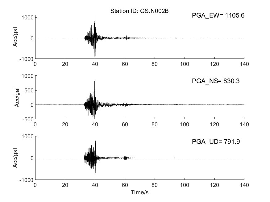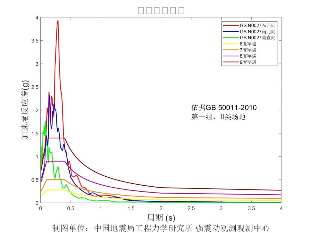地震后工力所強震動觀測中心共收取距震中100公里范圍內實時強震儀記錄57組、烈度儀記錄182組。中心立即組織人員進行處理。獲取記錄臺站加速度記錄分析結果見表1,其中GS.N0028 臺烈度最大,其震中距為13.6km,東西、 南北、 垂直向加速度峰值分別為 905.8cm/s2、778.5cm/ s2、-702.4cm/ s2,東西、南北、垂直向速度峰值分別為57.3cm/s、-52.1cm/s、-16.3 cm/s,計算儀器地震烈度9.5度。GS.N002B 臺峰值加速度最大,其震中距為12.3km,東西、 南北、 垂直向加速度峰值分別為 1071.4cm/s2、856.8cm/ s2、796.1cm/ s2,東西、南北、垂直向速度峰值分別為-30.7cm/s、-21.5cm/s、-10.1 cm/s,計算儀器地震烈度9.2度。GS.N0027臺震中距最小,其震中距為5.8km,東西、南北、垂直向加速度峰值分別為823.9cm/s2、-533.3cm/ s2、 692.7cm/ s2,東西、南北、垂直向速度峰值分別為-39.8cm/s、-28.9cm/s、-11.3 cm/s,計算儀器地震烈度8.8度。儀器地震烈度分布圖見圖1,地震峰值加速度分布圖見圖2,地震峰值速度分布圖見圖3,地震加速度反應譜(T=0.3s、T=1.0s、T=3.0s)分布圖見圖4、圖5、圖6,GS.N0028 臺強震動記錄見圖7,GS.N0028臺加速度反應譜見圖8,GS.N0028臺傅里葉幅值譜見圖9,GS.N002B臺強震動記錄見圖10,GS.N002B臺加速度反應譜見圖11,GS.N002B臺傅里葉幅值譜見圖12,GS.N0027臺強震動記錄見圖13,GS.N0027臺加速度反應譜見圖14,GS.N0027臺傅里葉幅值譜見圖15。