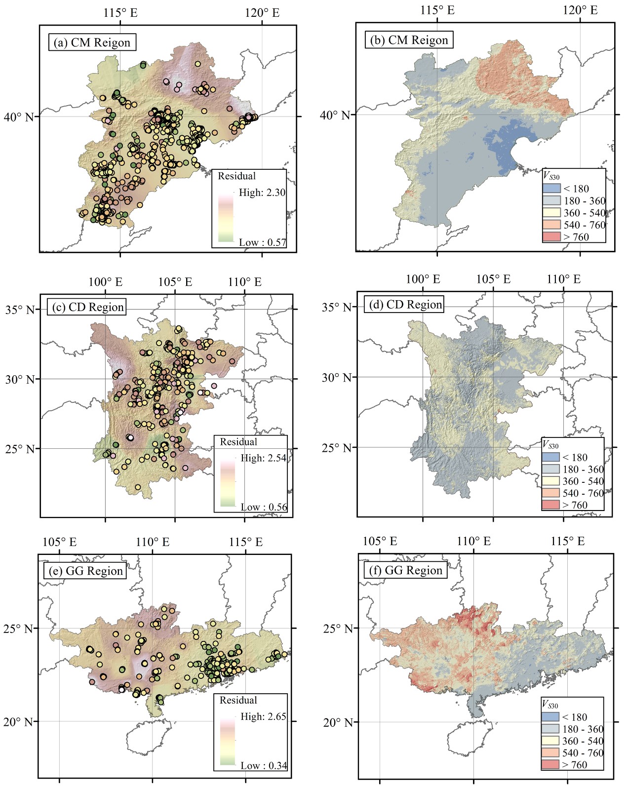圖4首都圈、川滇及兩廣地區殘差的空間變化趨勢及更新后的區域VS30預測結果