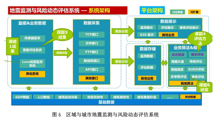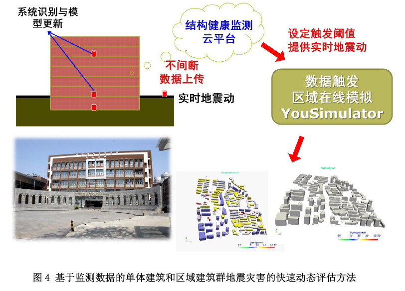 項目集成了新型傳感器、先進(jìn)的組網(wǎng)技術(shù)、秒級計算效率的基于監(jiān)測數(shù)據(jù)的單體建筑和區(qū)域建筑群地震災(zāi)害的快速動態(tài)評估方法(圖4)等創(chuàng)新性成果,開發(fā)了“區(qū)域與城市地震監(jiān)測與風(fēng)險動態(tài)評估系統(tǒng)”(圖5),實現(xiàn)了基于監(jiān)測數(shù)據(jù)的公里網(wǎng)格級別的地震災(zāi)害風(fēng)險快速動態(tài)評估,提升了區(qū)域與城市地震災(zāi)害風(fēng)險評估的時效性和精度。
