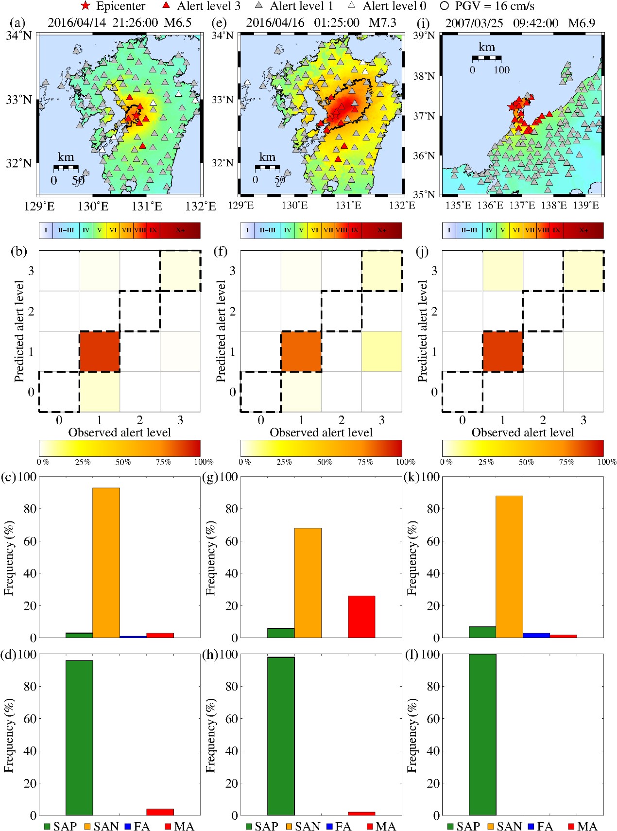 圖2 三次大地震事件的警報水準預(yù)測與性能分析