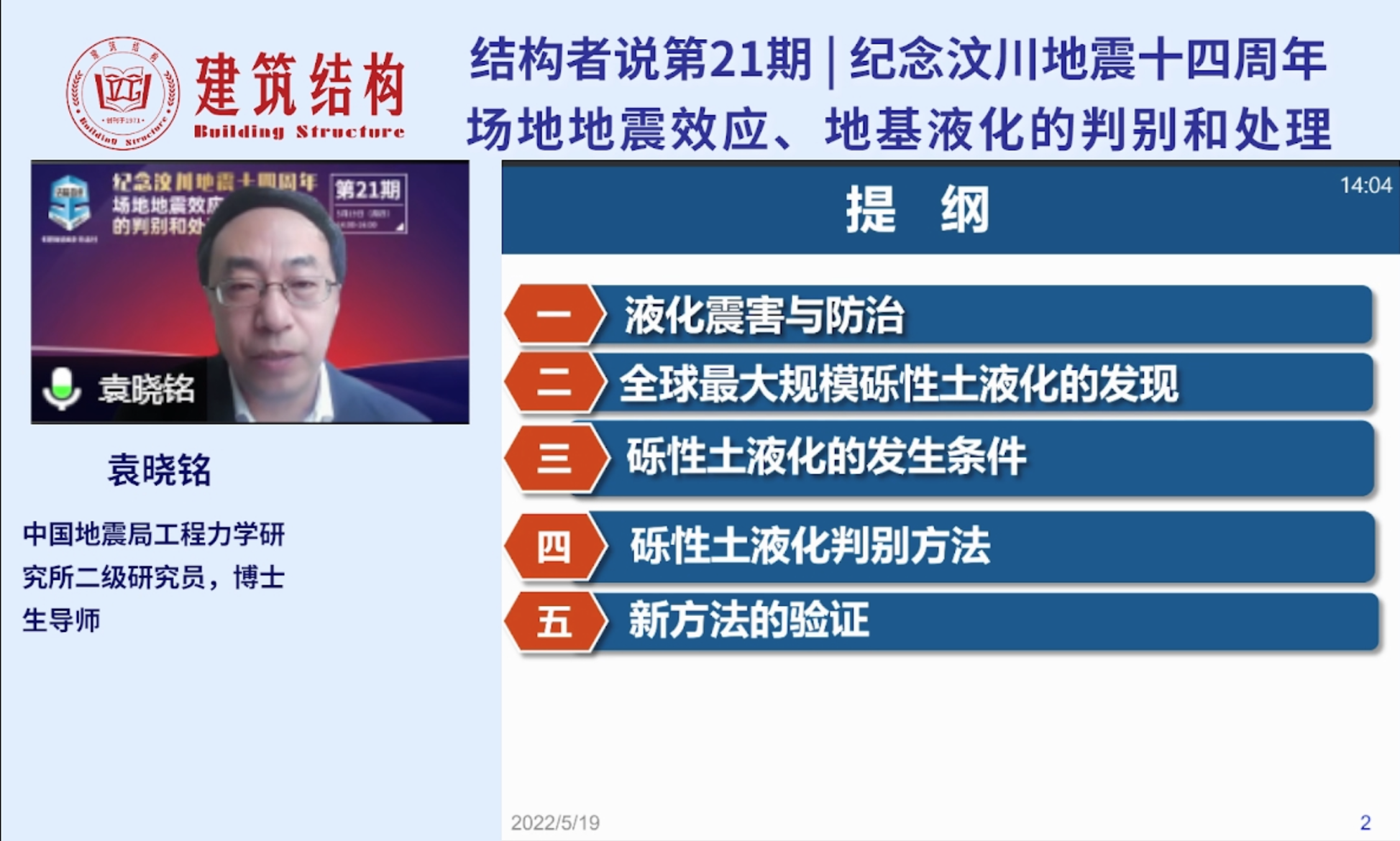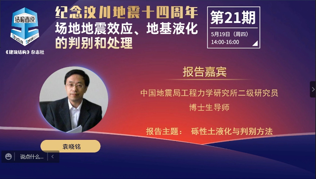 發(fā)布時間: 2022-05-24 點(diǎn)擊數(shù)量:8534袁曉銘研究員的報告中,介紹了2008年汶川大地震中發(fā)生的全球最大規(guī)模的礫性土液化及震害現(xiàn)象,解釋了礫性土液化的機(jī)理和觸發(fā)條件;介紹了具有中國特色的礫性土液化判別方法以及通過國際合作對新方法的驗證結(jié)果。報告面向一線工程技術(shù)人員,采用深入淺出的方式進(jìn)行講解,受到工程技術(shù)人員的歡迎。報告后的互動提問環(huán)節(jié),袁曉銘研究員在線回答了聽眾提出的關(guān)于“學(xué)校和醫(yī)院提高一度進(jìn)行液化設(shè)防的必要性”、“礫性土和砂土液化判別方法的差別”、“不液化和不考慮液化概念的區(qū)別”等一系列問題。
