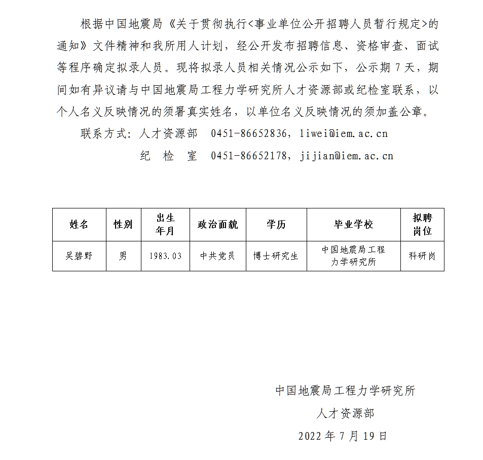 中國地震局工程力學(xué)研究所2022年擬錄用人員公示(四)